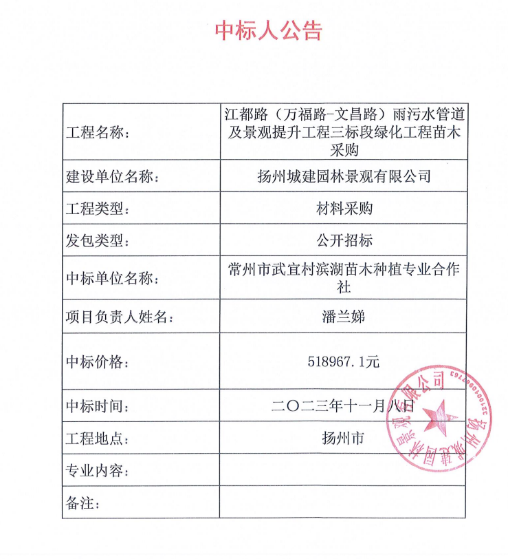 江都路(万福路-文昌路)雨污水管道及景观提升工程三标段绿化工程苗木采购中标人公告
