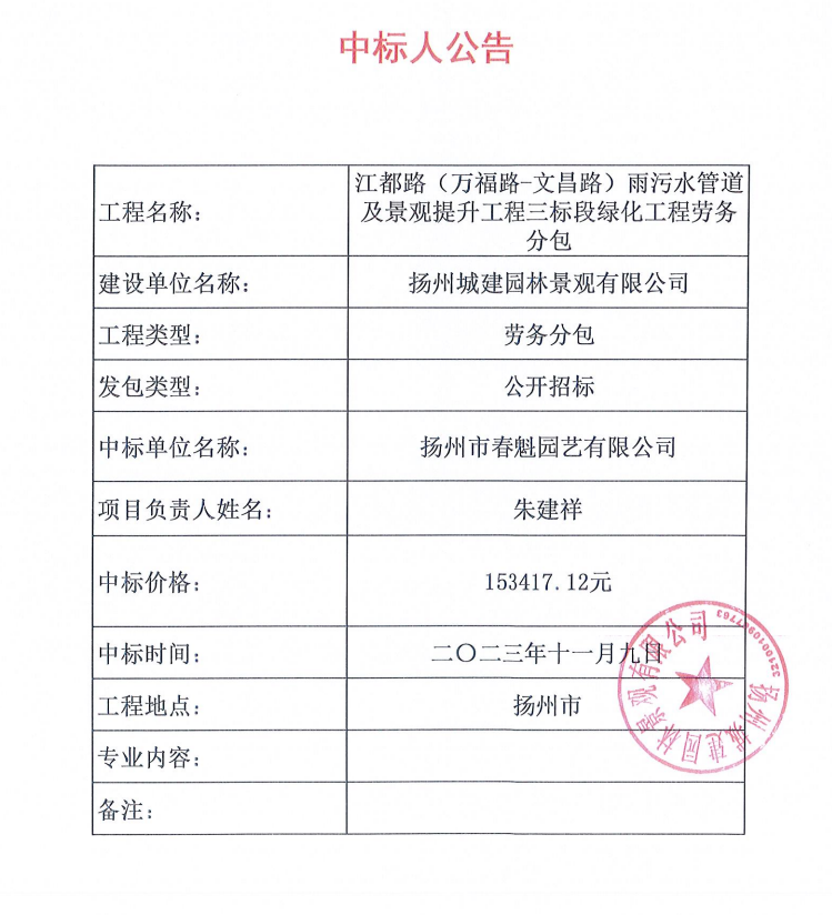 江都路(万福路-文昌路) 雨污水管道及景观提升工程三标段绿化工程劳务分包中标人公告