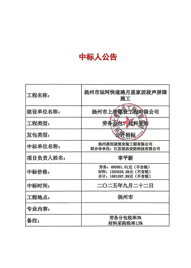 扬州市运河快速路月星家居段声屏障施工中标人公告