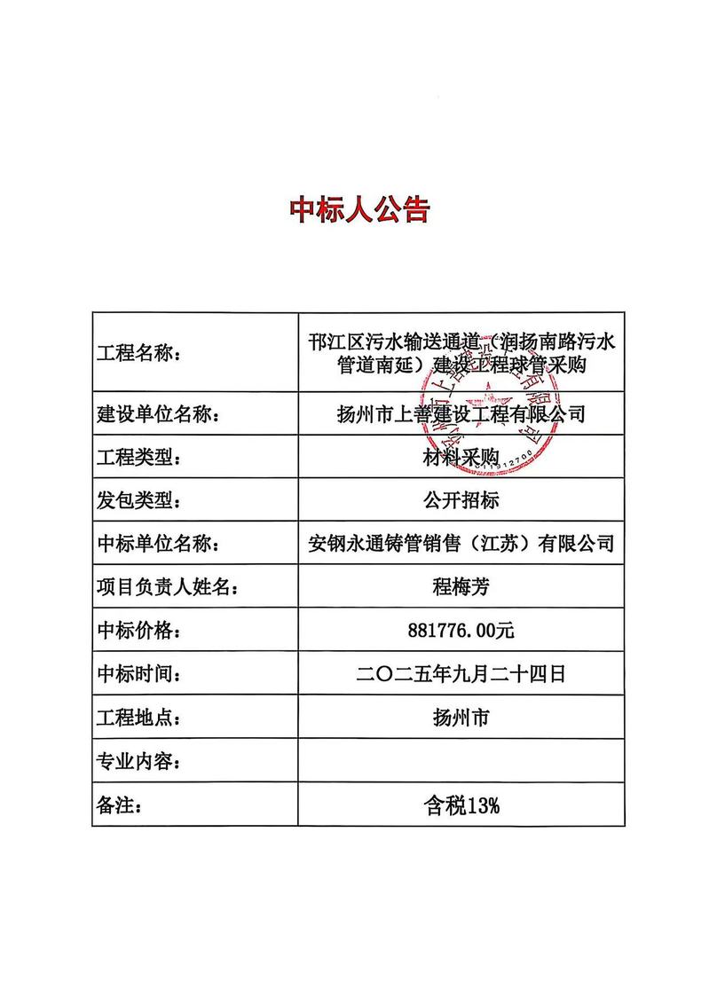邗江区污水输送通道(润扬南路污水管道南延)建设工程球管采购中标人公告
