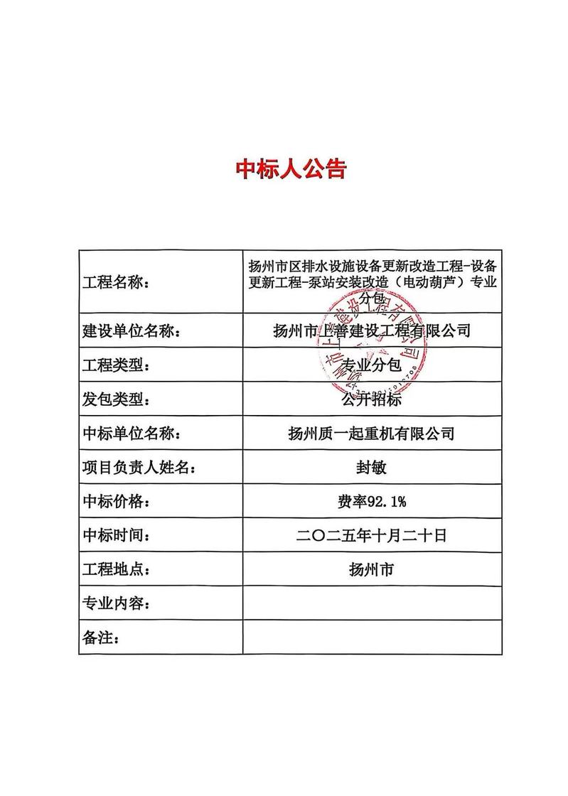 扬州市区排水设施设备更新改造工程-设备更新工程-泵站安装改造(电动葫芦)专业分包中标人公告