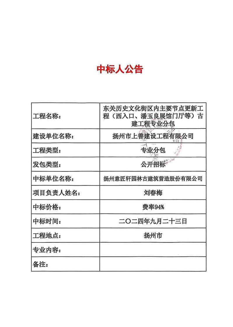 东关历史文化街区内主要节点更新工程(西入口、潘玉良展馆门厅等)古建工程专业分包中标人公告