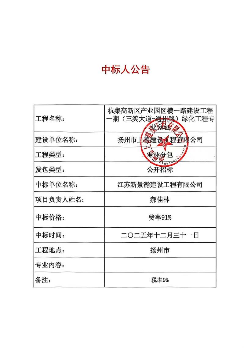杭集高新区产业园区横一路建设工程一期(三笑大道-通州路)绿化工程专业分包中标人公告