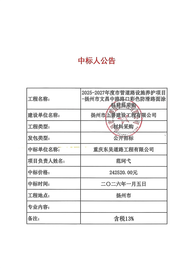 2025-2027年度市管道路设施养护项目-扬州市文昌中路路口彩色防滑路面涂料材料采购中标人公告