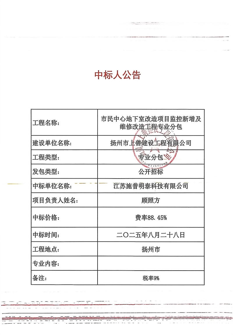 市民中心地下室改造项目监控新增及维修改造工程专业分包中标人公告