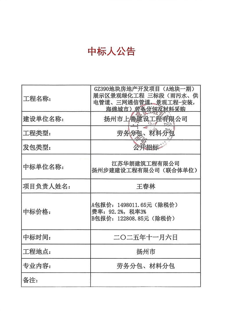 GZ390地块房地产开发项目(A地块一期)展示区景观绿化工程 三标段(雨污水、供电管道、三网通信管道,景观工程-安装,海绵城市)劳务分包及材料采购中标人公告