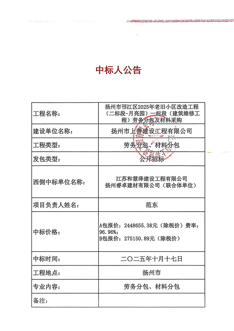 扬州市邗江区2025年老旧小区改造工程(二标段-月亮园)一标段(建筑维修工程)劳务分包及材料采购中标人公告