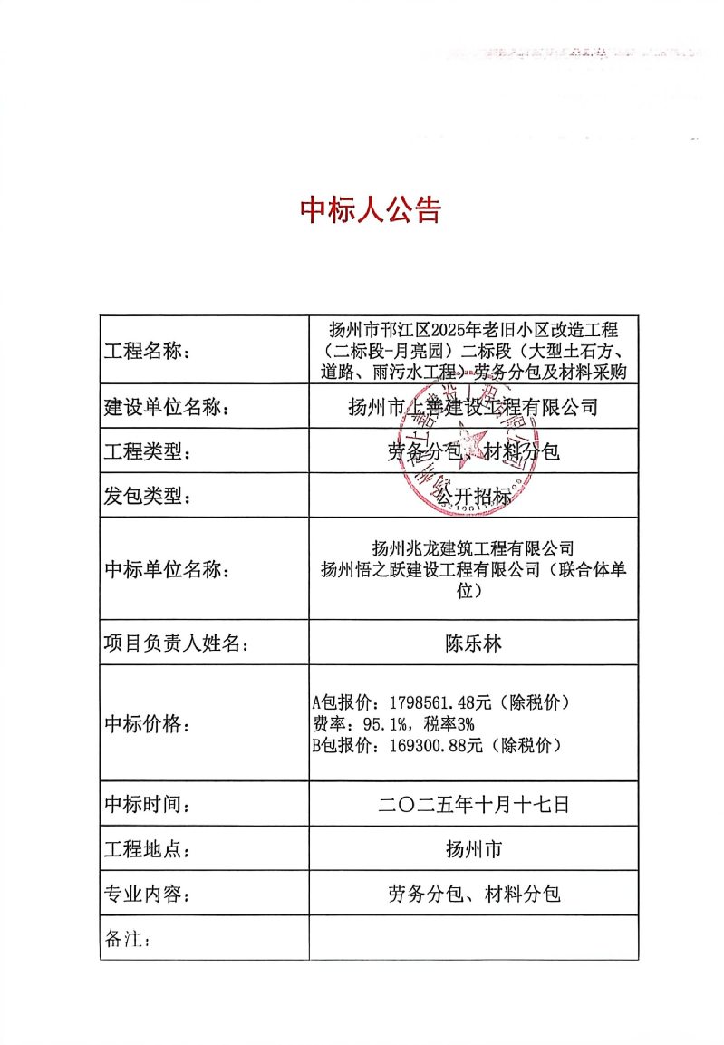 扬州市邗江区2025年老旧小区改造工程(二标段-月亮园)二标段(大型土石方、道路、雨污水工程)劳务分包及材料采购中标人公告