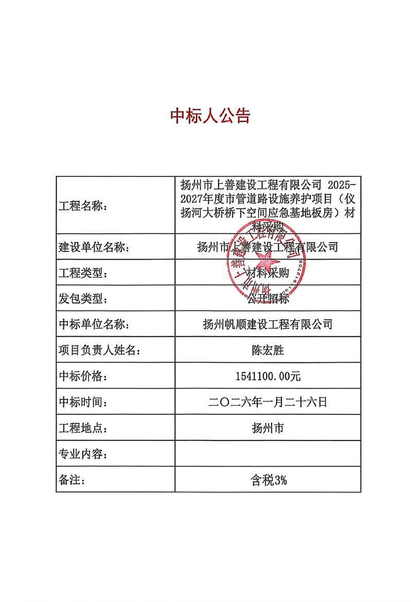 扬州市上善建设工程有限公司 2025-2027年度市管道路设施养护项目(仪扬河大桥桥下空间应急基地板房)材料采购中标人公告
