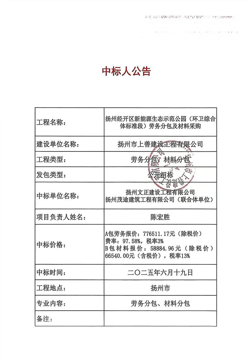 扬州经开区新能源生态示范公园(环卫综合体标准段)劳务分包及材料采购中标公告
